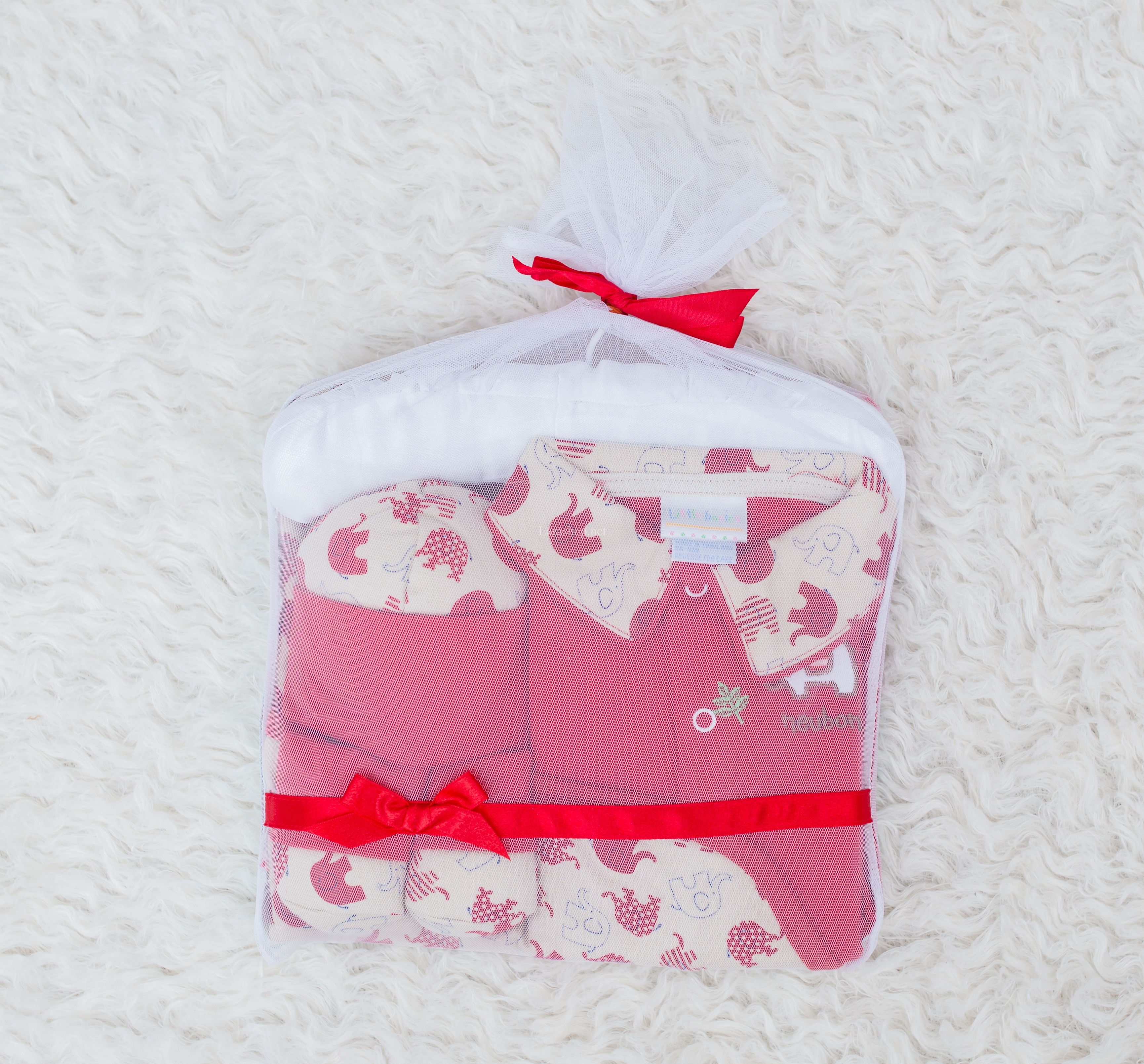 Gift set túi lưới 5 món (gồm bodysuit dài, nón, găng tay, khăn quấn, móc áo), hàng Thái – X769 Size 0-3m, 3-6m – 200k/set