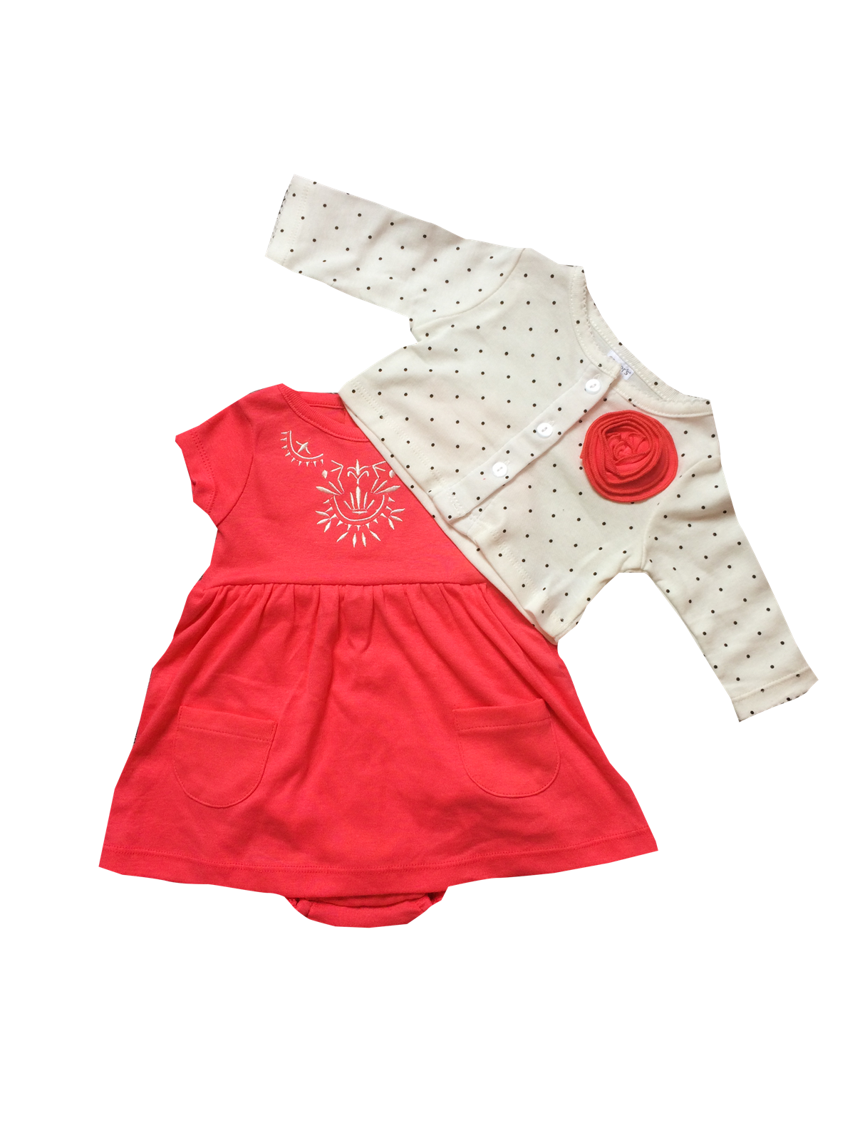 Set váy body, cổ áo thêu họa tiết màu đỏ cam, kèm áo khoác lửng chấm bi trắng, hàng Thái – Carter’s X951 Size 3m, 6m, 9m, 12m – 175k/set