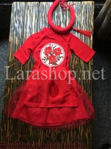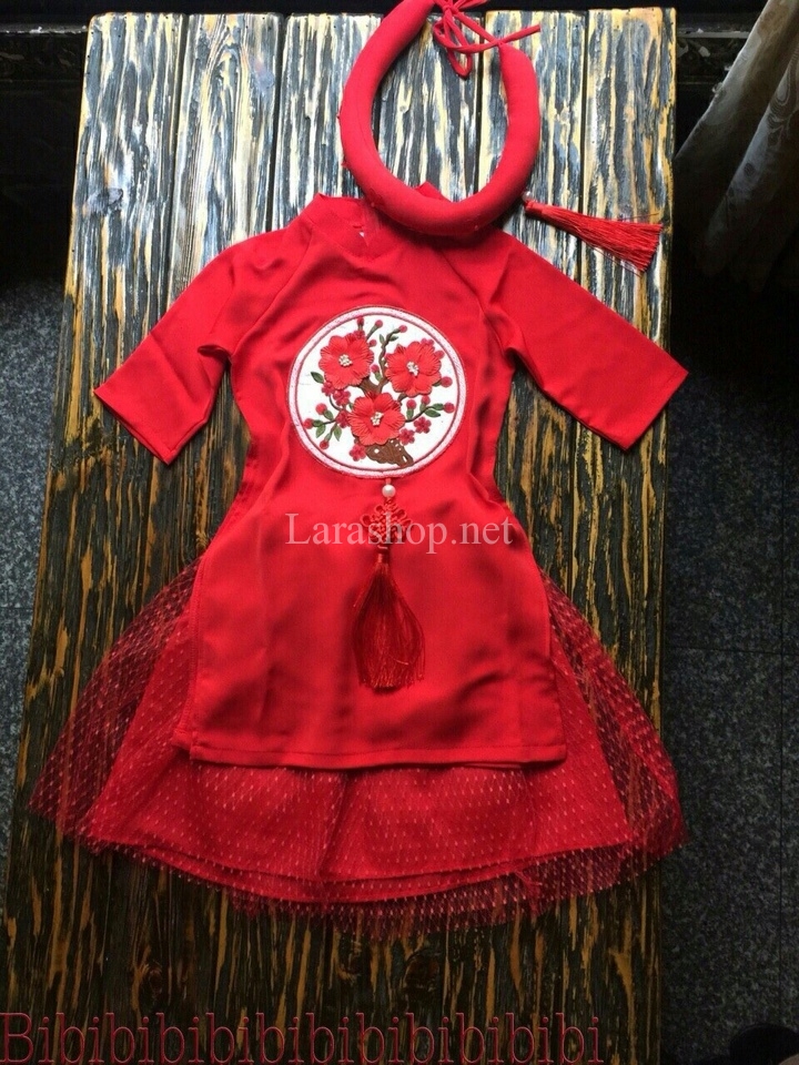 Bộ áo dài lụa đỏ thêu hoa phối chân váy và mấn, size đại – A378
