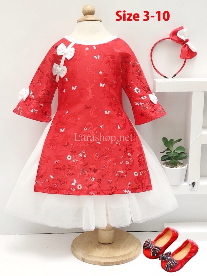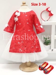 Áo dài tay loe gấm lụa đỏ phối chân váy voan, kèm cài – A385