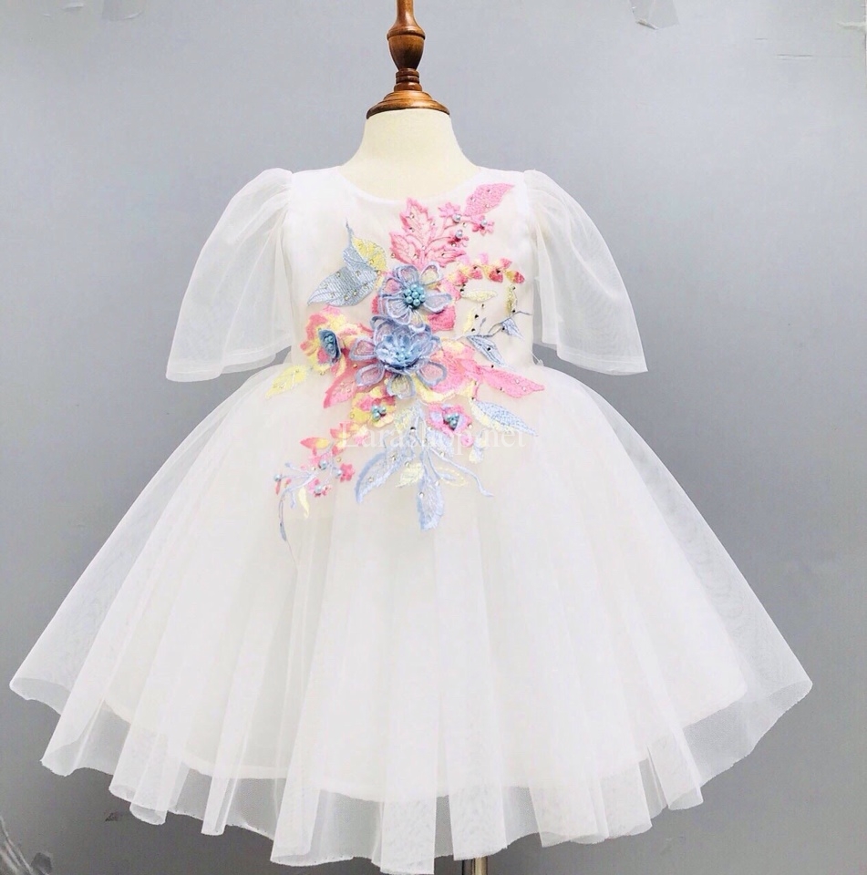 Đầm voan trắng tay cánh tiên thêu kết hoa sang trọng – A383 Size 1, 2, 3, 4, 5, 6, 7, 8, 9, 10 – 250k