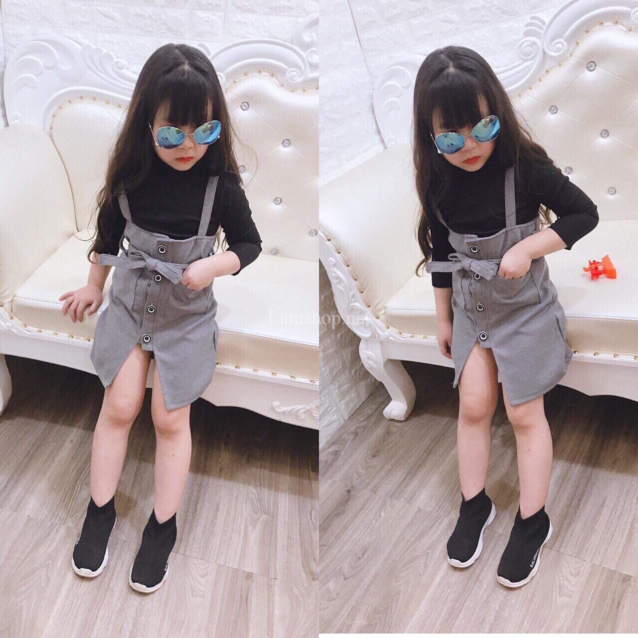 Set yếm xám thun da cá phối áo thun cotton cổ lọ dài tay đen, có 2 dòng size nhí và đại – A401 Size nhí 2-9: 160k/set ; size đại 10-15: 170k/set