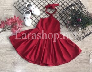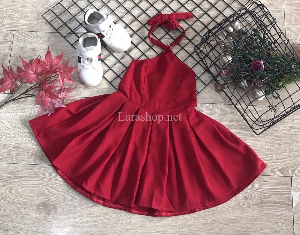 Đầm xếp ly tùng xoè cột dây cổ yếm đỏ đô – A421