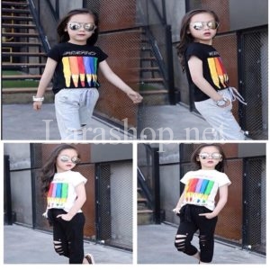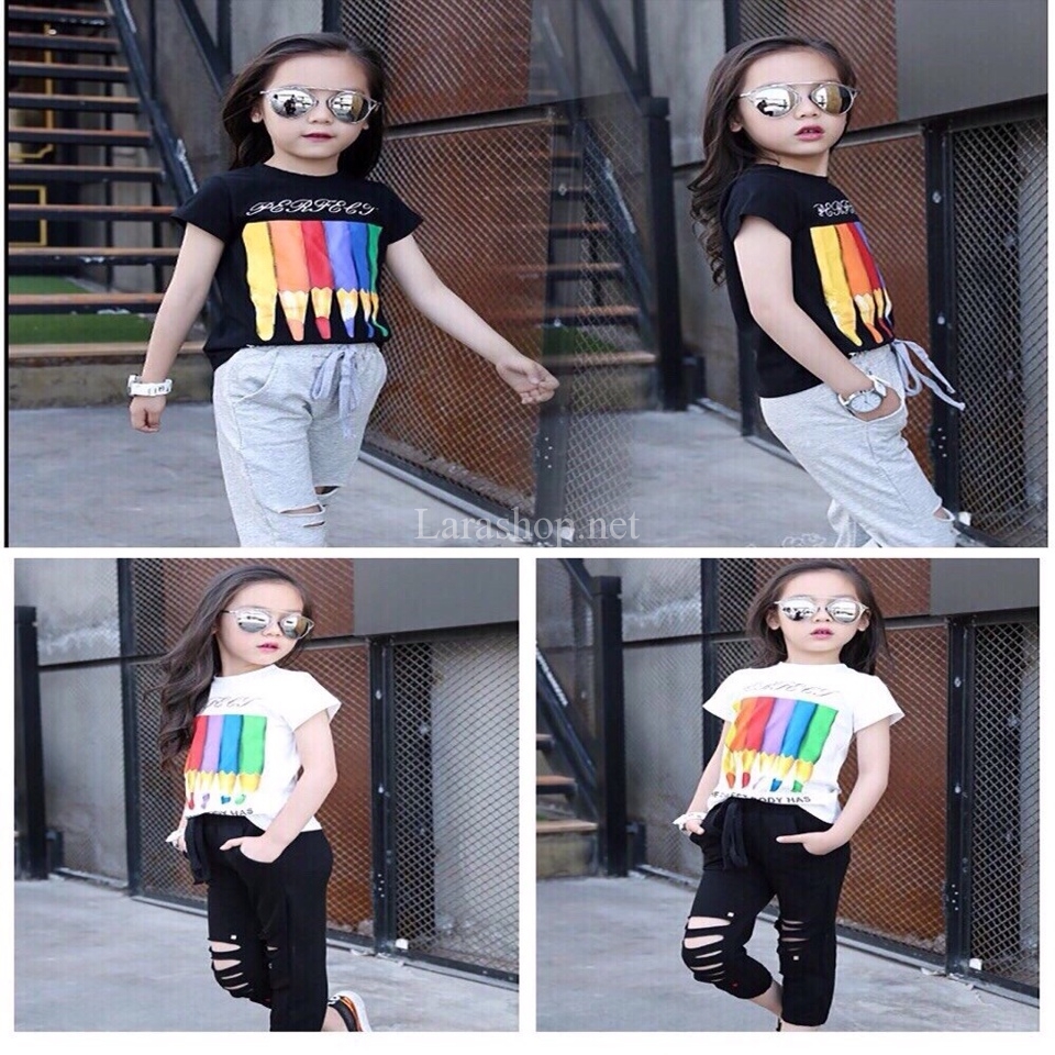 Bộ áo cotton in chì màu phối quần cà rách (chỉ có áo trắng quần đen), size đại – A530 Size 10, 11, 12, 13, 14, 15 , 16 – 165k/bộ