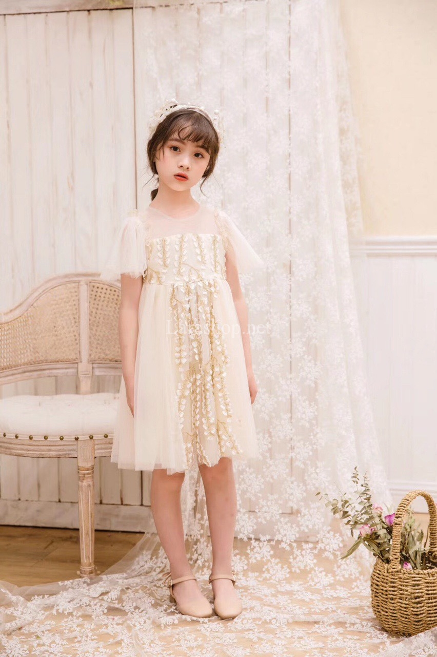 Đầm voan tay cánh tiên màu kem, hàng Quảng Châu – N211