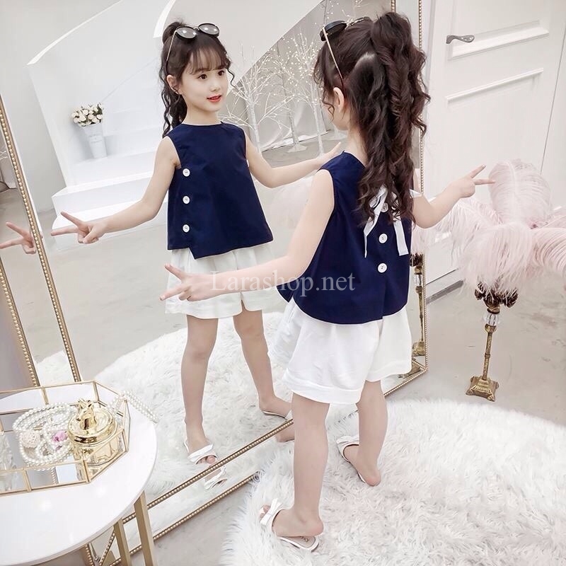 Bộ áo nút xanh dương phối váy short trắng – A669