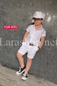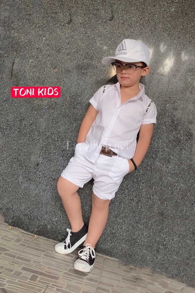 Áo sơ mi trắng viền vai, quần kaki lửng trắng, không kèm thắt lưng – A779