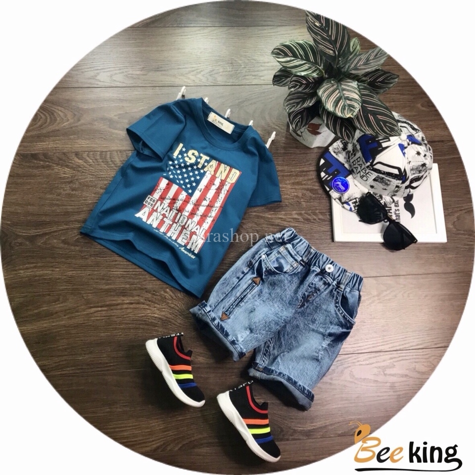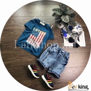 Bộ áo thun in cờ phối jean lửng – A796