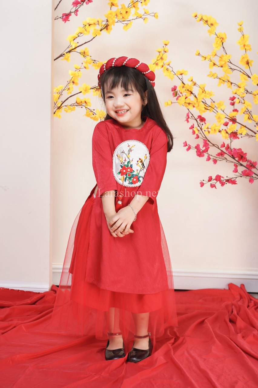 Set áo dài gấm đỏ phối chân váy voan kèm mấn – A905