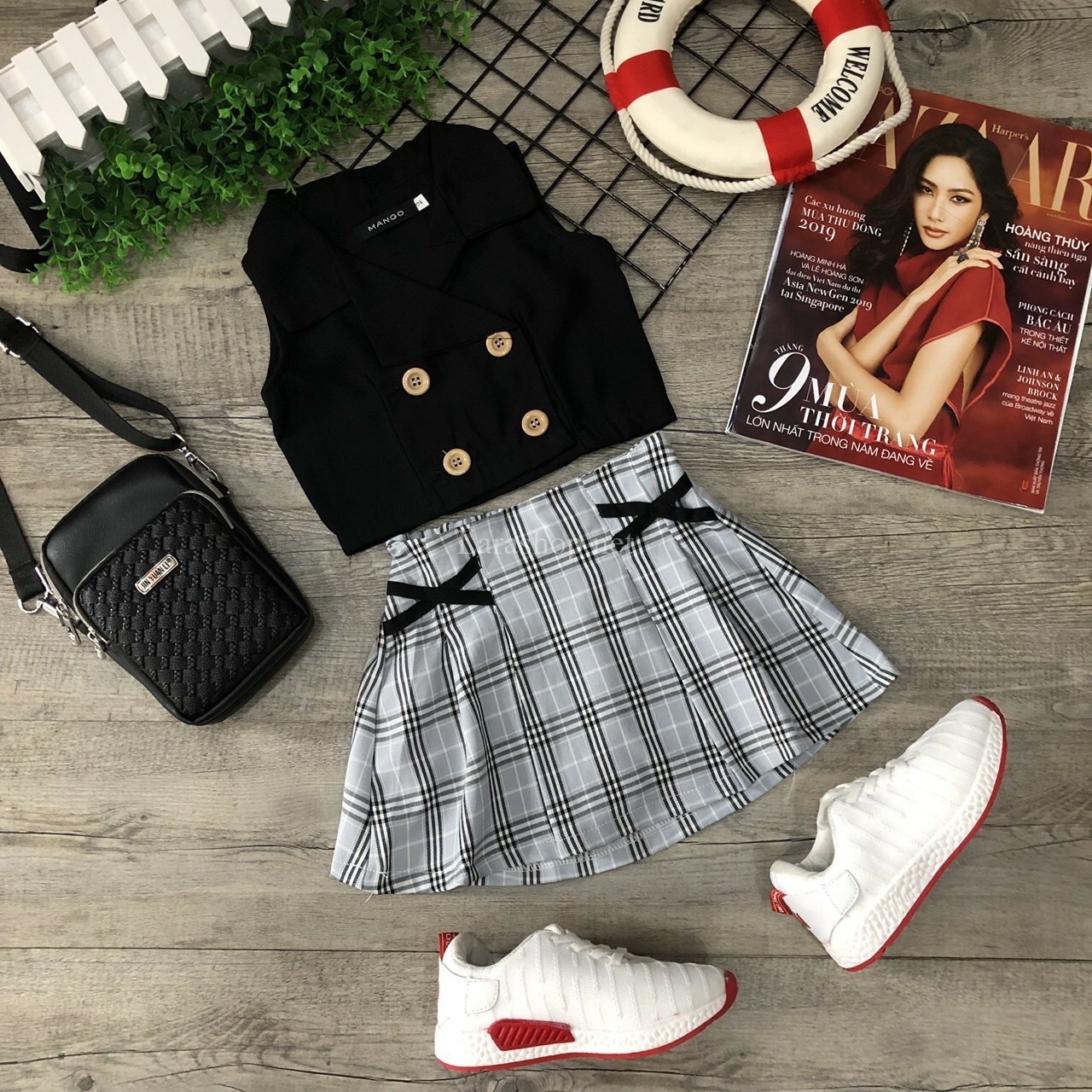 Áo croptop giả vest phối chân váy caro, size đại – A989