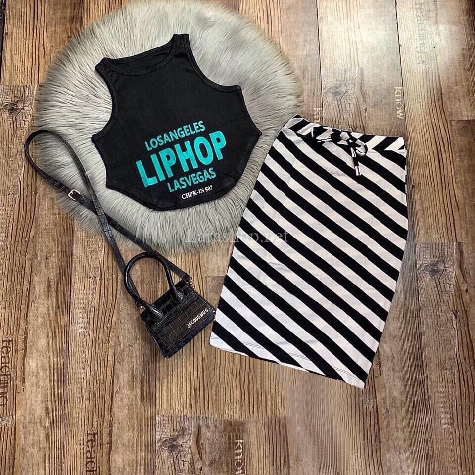 Set áo croptop phối chân váy bút chì sọc, có 2 dòng size nhí và đại – R067