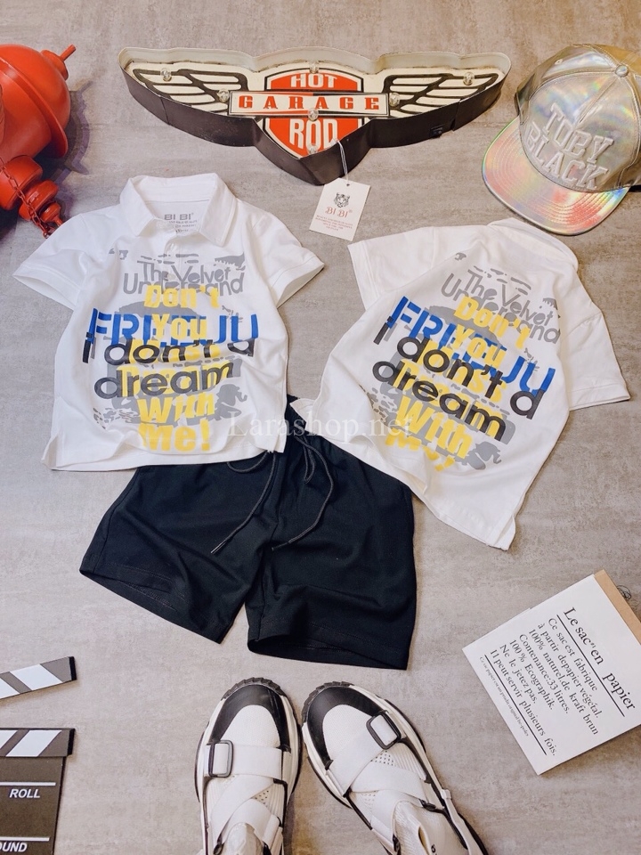 Áo cổ trụ in chữ phối lửng, có 3 dòng size nhí đại cồ – R261 Size nhí 2-9, 155k/bộ; size đại 10-16, 165k/bộ; size cồ 17-22, 185k/bộ (10-60kg)