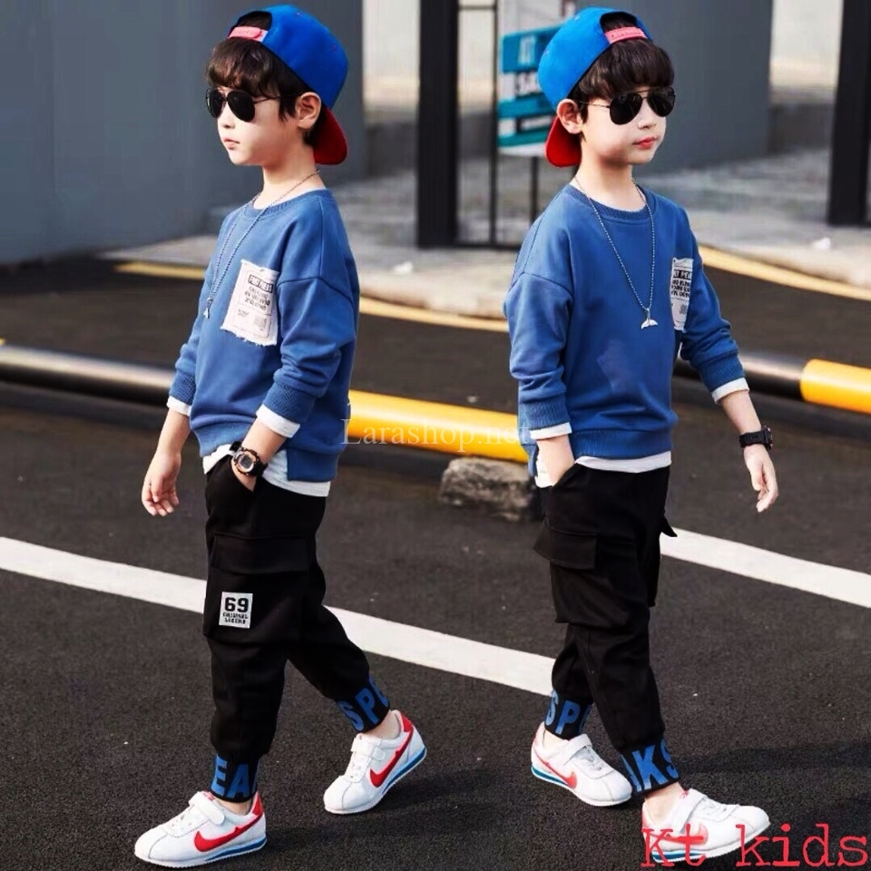 Bộ thun cotton dài tay phối lai trắng, quần bo ống in chữ, size đại – R289 Size 10, 11, 12, 13, 14, 15 – 165k/bộ