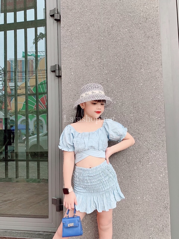 Set áo croptop cột nơ lưng phối chân váy smocking, màu xanh da trời nhạt, có 2 dòng size nhí và đại – R298 Size nhí 2-9, 150k/set; size đại: 10-15, 165k/set
