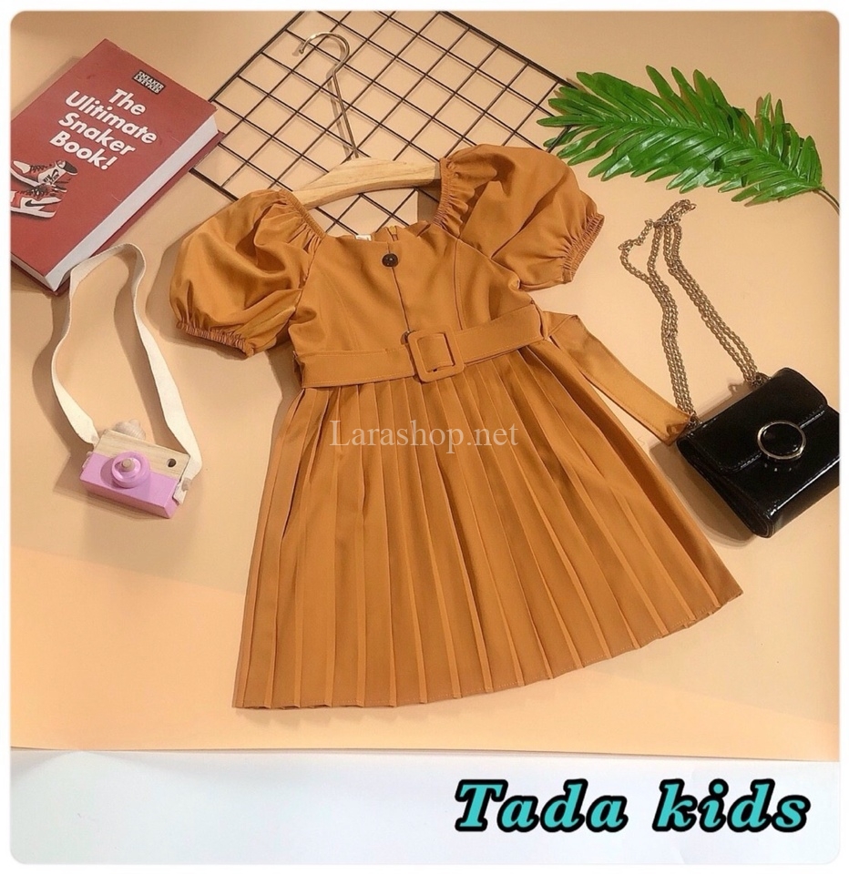 Đầm xếp ly kèm thắt lưng màu da bò, có 2 dòng size nhí và đại – R337 Size nhí 2-9, 160k; size đại 10-15, 175k