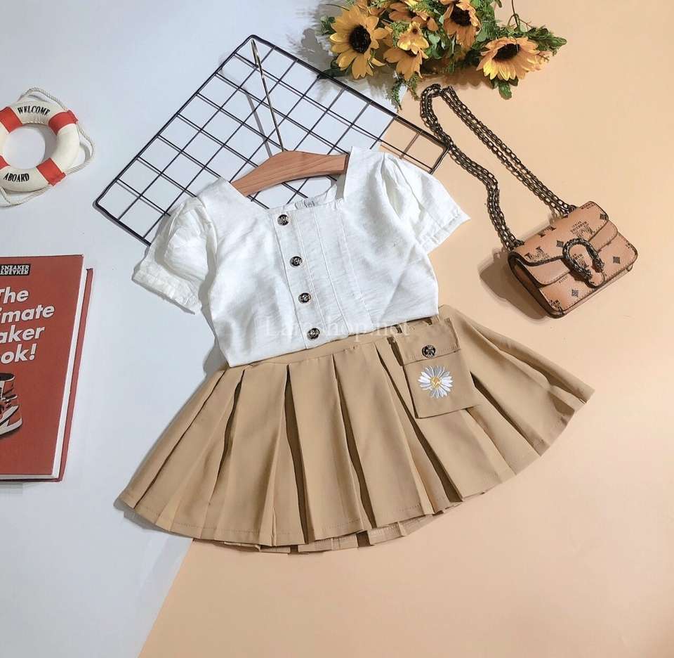 Set áo cài nút phối chân váy xếp ly thêu hoa cúc, size đại – R364 Size 10, 11, 12, 13, 14, 15 – 165k/set