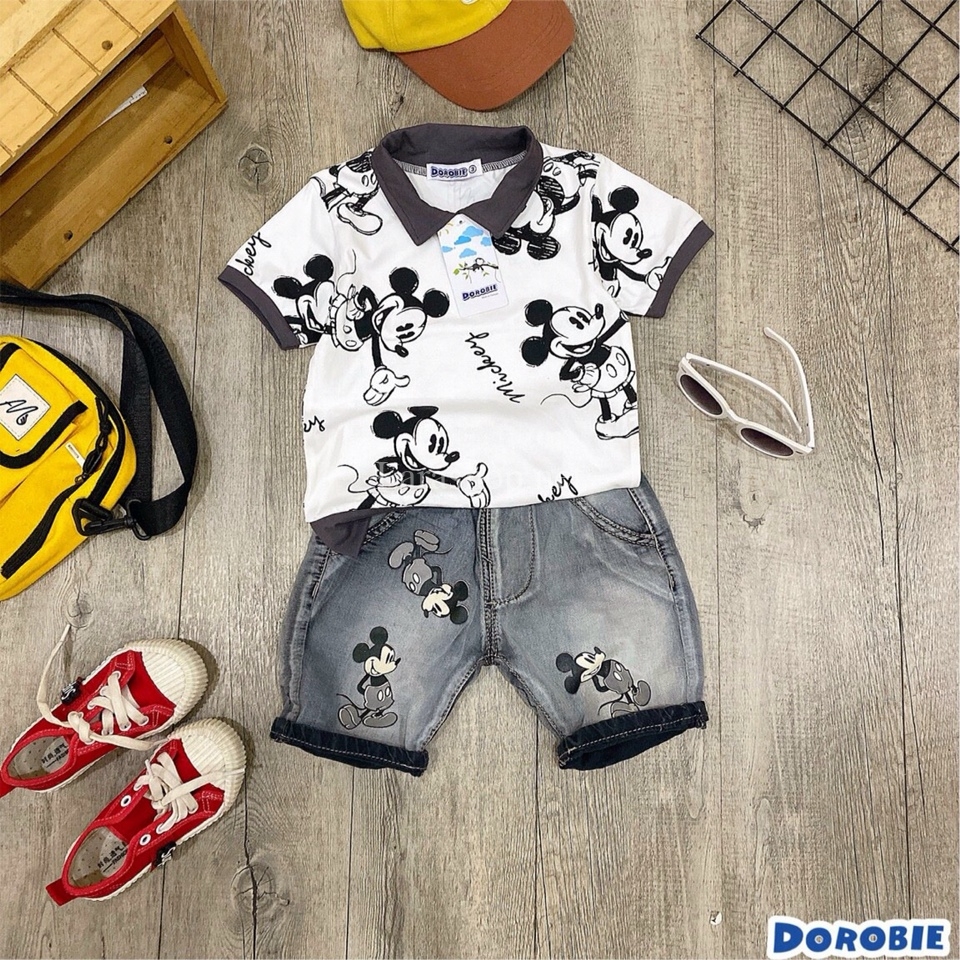 Bộ áo cotton cổ trụ phối jean lửng Mickey – R560