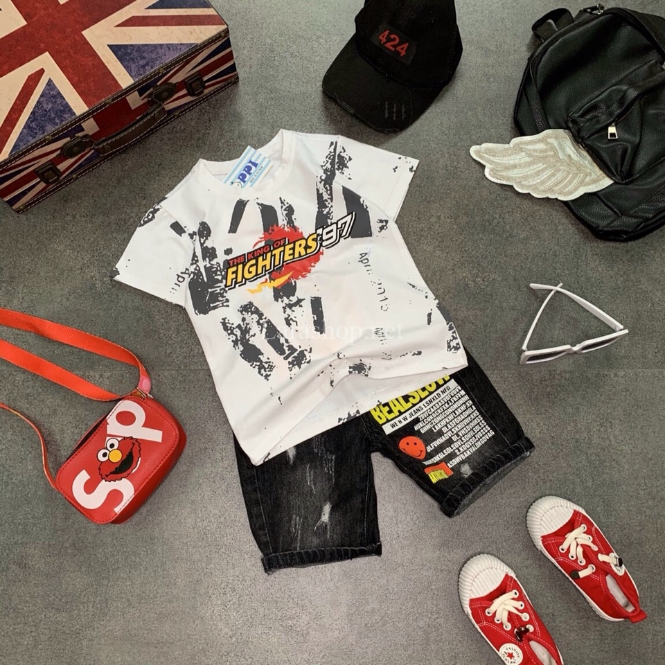 Bộ áo cotton in hình phối jean lửng, size cồ – R572