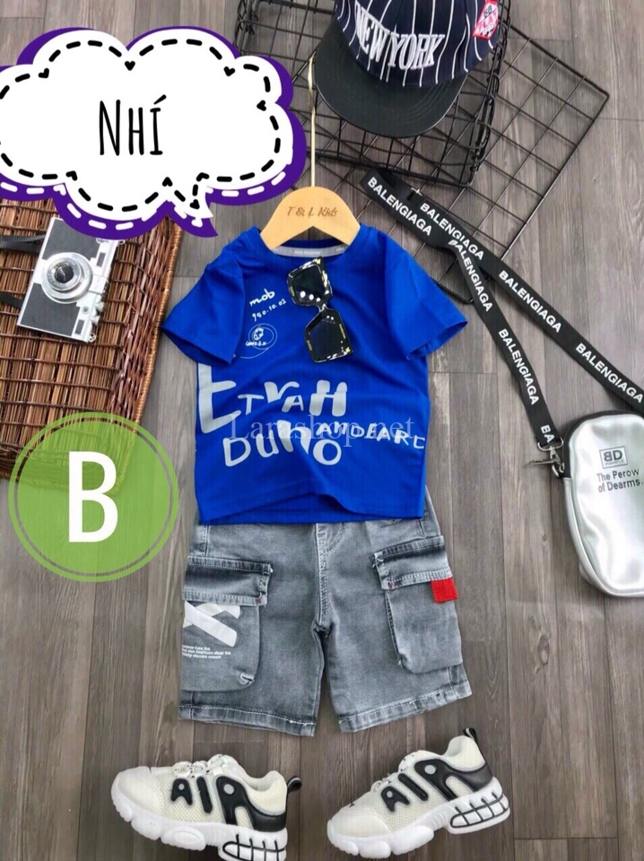 Bộ áo cotton in chữ phối jean lửng túi hộp – R623
