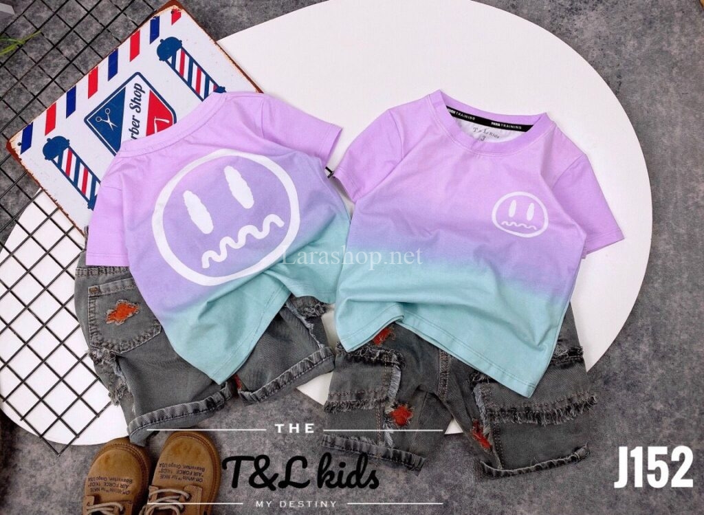 Bộ áo cotton in phun phối jean lửng, có 2 dòng size nhí và đại – Y044