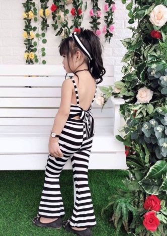 Bộ sọc, áo 2 dây thắt nơ lưng phối quần ống loe, kèm băng đô – A690