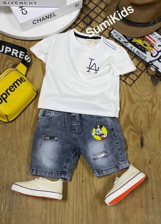 Bộ áo cotto trắng phối jean lửng in Mickey, size nhí – Y050